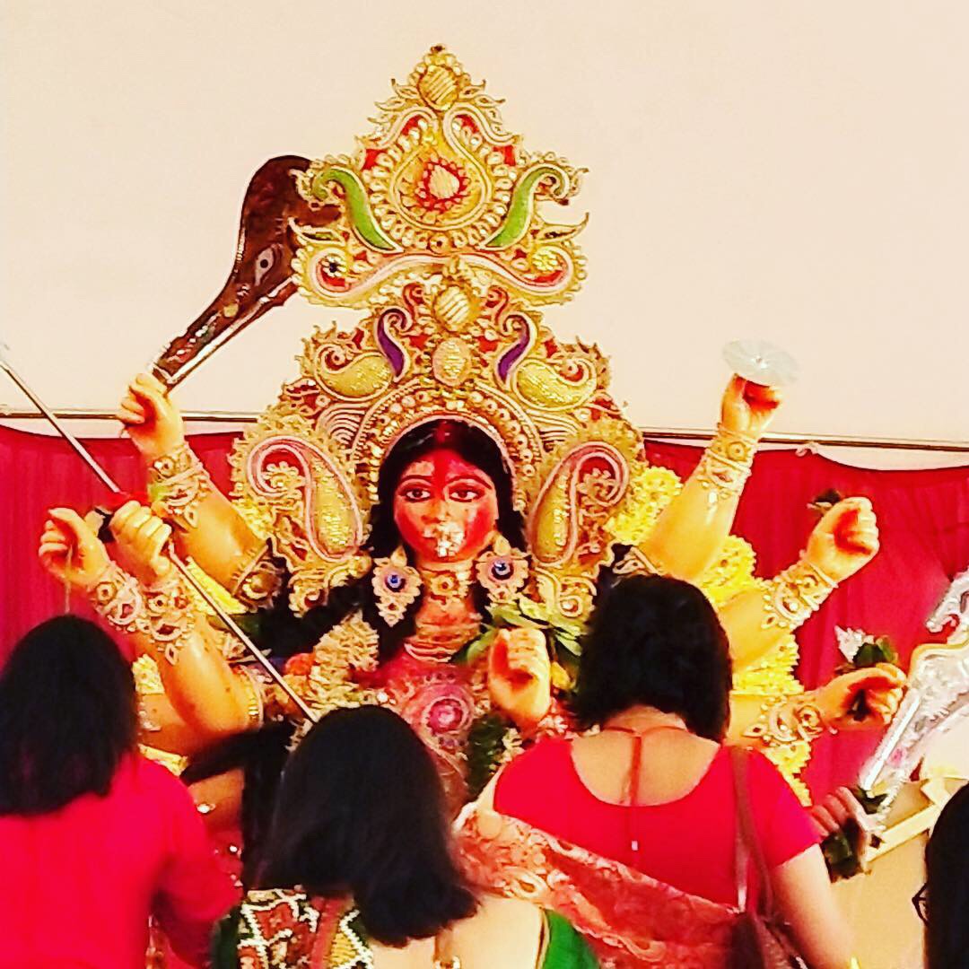 Her third eye is awake, her bright saree is new, her lips are red,